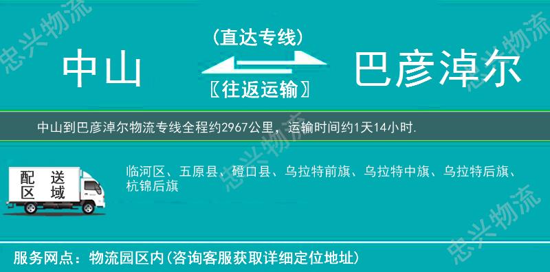 ★ 本站所列中山橫欄鎮到巴彥淖爾物流專(zhuān)線(xiàn)費用與時(shí)效僅供參考,如需詳細了解收費標準請電話(huà)咨詢(xún)。
